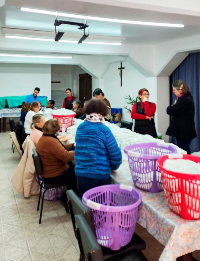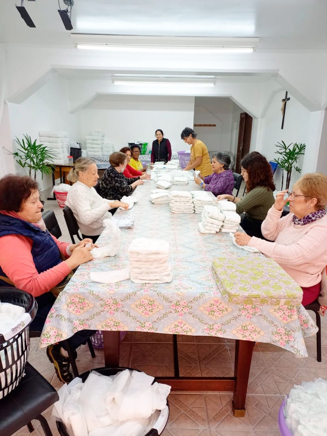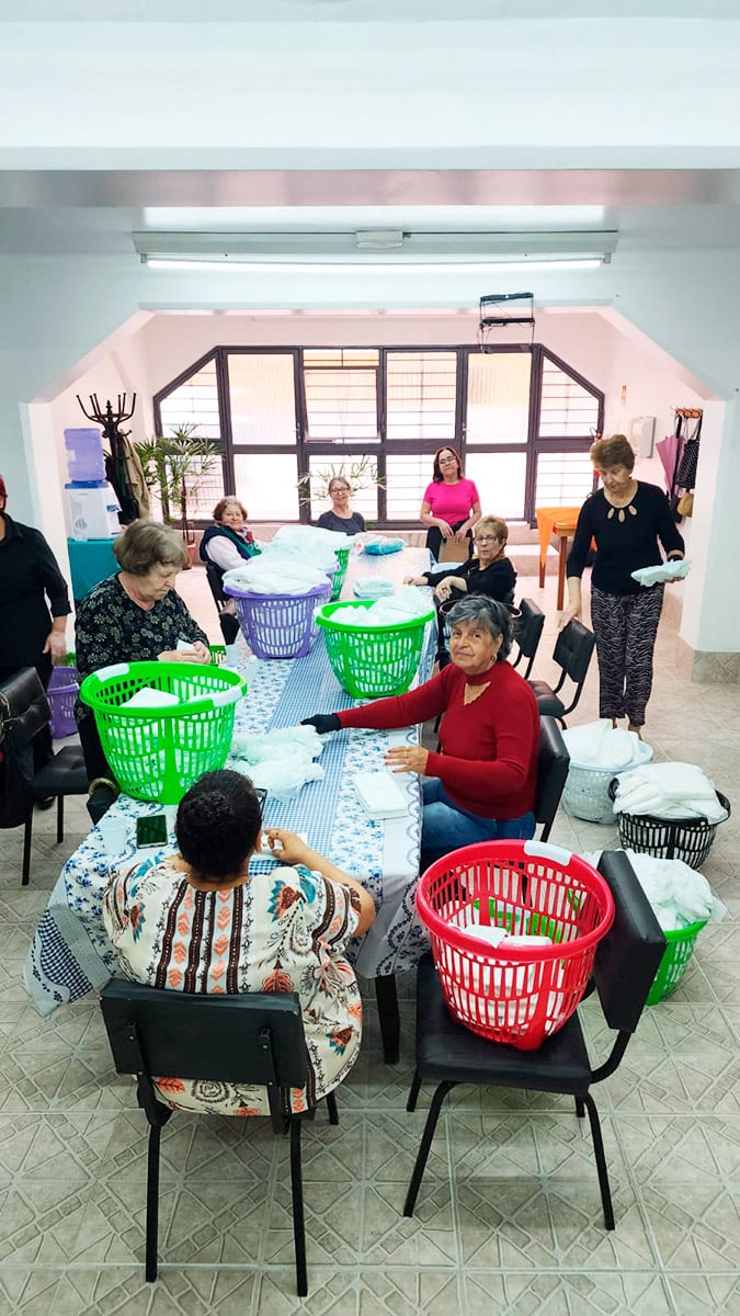 Ao longo desses anos, já doamos milhares de fraldas, contemplando asilos, casas geriátricas, hospitais, paróquias, e assim por diante. Nesse contexto, entra o trabalho das voluntárias.